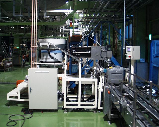 左上のボウルフィーダー(パーツフィーダー)からキャップを供給し、右の部分でキャップを自動で締付けます。