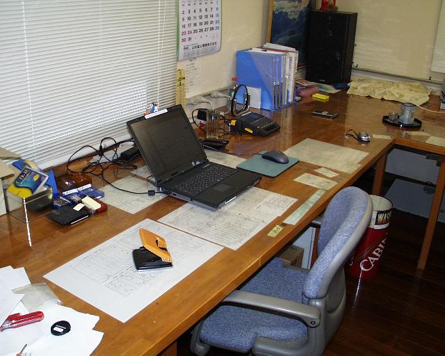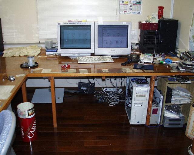 写真1:メインのデスクトップマシン:自作機 元々はNEC VALUESTAR NX 266MHzだったんですけど、誰も信じてくれません(笑) 現在の仕様は AMD Athlon 1GHz メモリ 512MB です。蓋が開けっ放しになっているのは放熱のためです。ディスプレイは22インチ×2 ツインディスプレイって奴です。