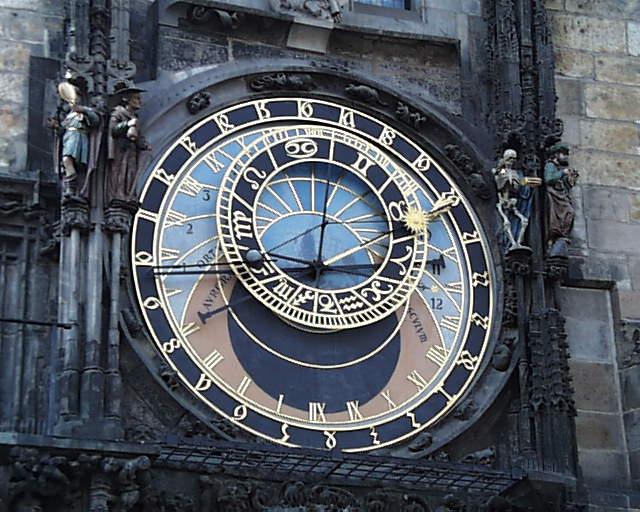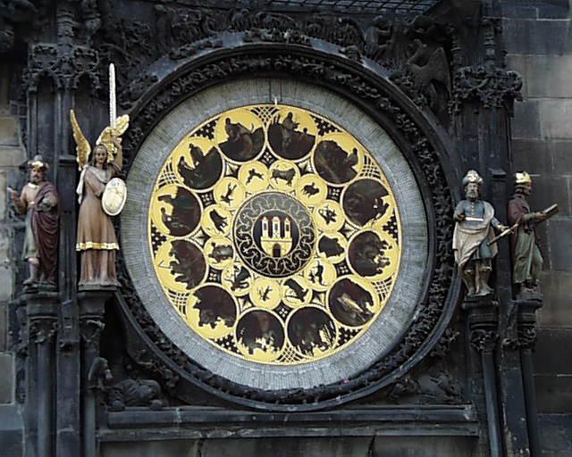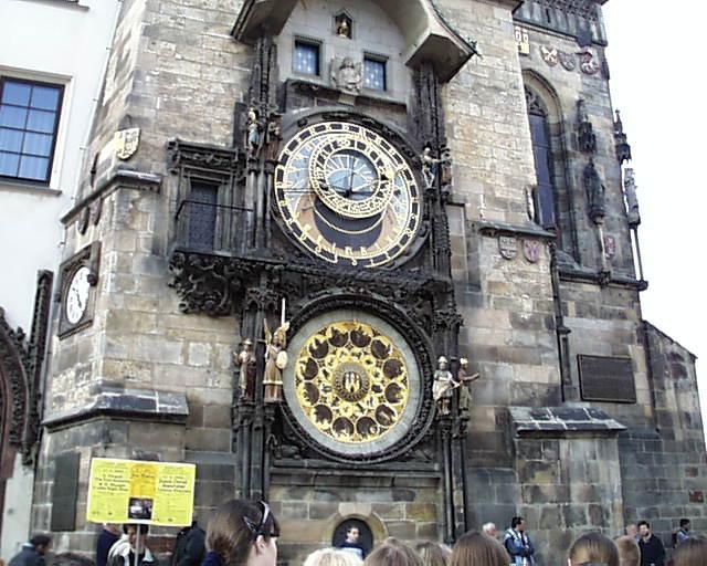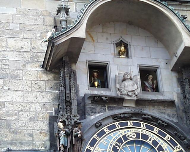 15世紀に作れらた天動説に基づいて作られた天文&仕掛け時計。正時(0分)になると上の窓が二つ開いてキリストの12使徒が窓の中を動いていく。ちょっとわかりにくいのですが、仕掛け時計の写真の中に移っています。