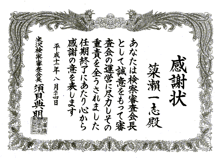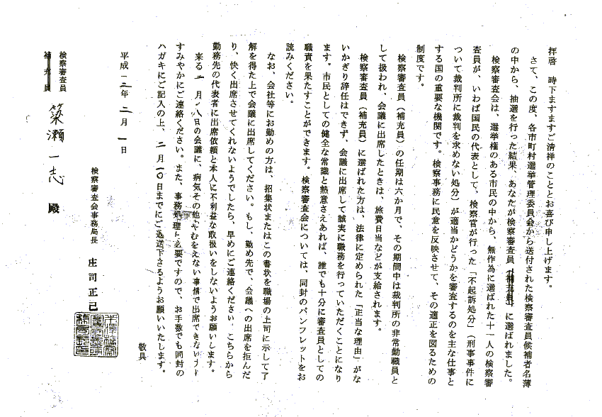 平成12年の2月〜8月まで検察審査会に任命されていました。5月〜8月までは、なんと検察審査会長を勤めていました。検察審査会は一般の人が法律(司法)に関われる唯一の機会です。法律に素人だからなんて関係ありません。なんと、人選はくじ引きです。