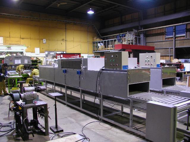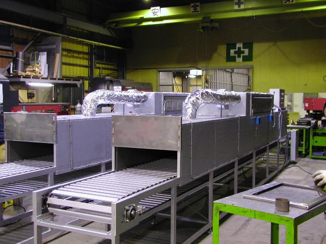 塗装等を乾燥させるコンベアです。暖める必要のある全ての用途に使用できます。ヒーターは外気温5度程度の条件で、ヒーター部で120度程度まで加熱できます(出口部温度で約70度)。