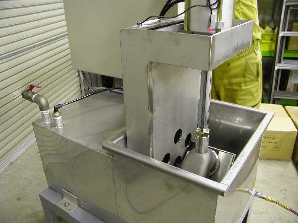 製品を水に沈め、製品内部に高圧空気を充填して、ひびやホール(穴)等が入っていないか確認する機械です(手動式)
